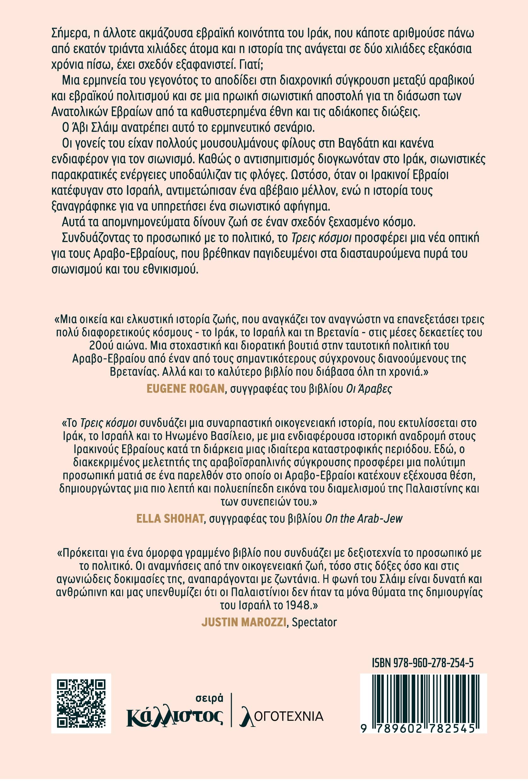 Το ενδιαφέρον, ιδεολογικά φορτισμένο βιβλίο του Άβι Σλάιμ Τρεις κόσμοι είναι μια γλυκόπικρη αυτοβιογραφία ενός επιτυχημένου Ιρακινού Εβραίου που εγκατέλειψε την πατρίδα του υπό πίεση, μια παθιασμένη αναδρομή στη χαμένη εβραϊκή κοινότητα του Ιράκ και μια καυστική κριτική του σιωνισμού και του Ισραήλ.